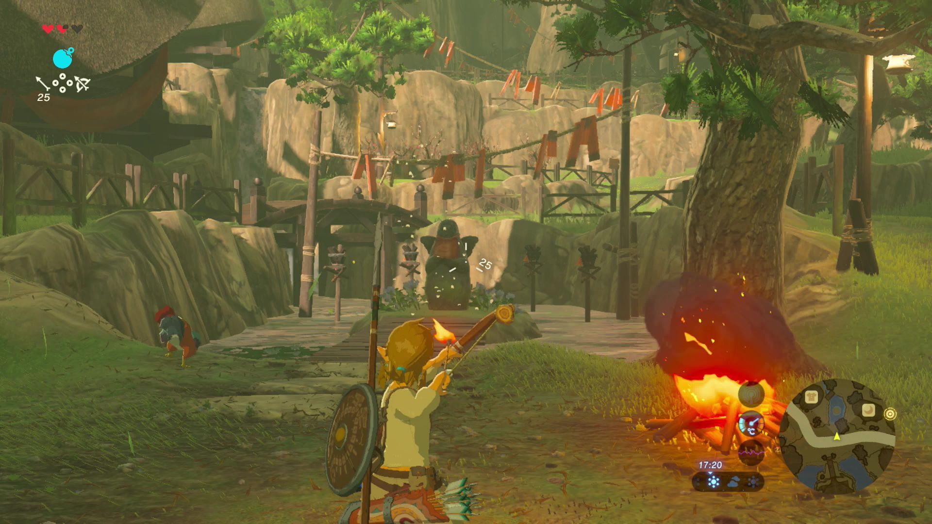 Si tienes ambos objetos ve hacia la estatua de la diosa de la aldea, equípate el arco y apunta la flecha hacia la hoguera para que comience a arder y dispara a cualquiera de las antorchas que rodean a la estatua.