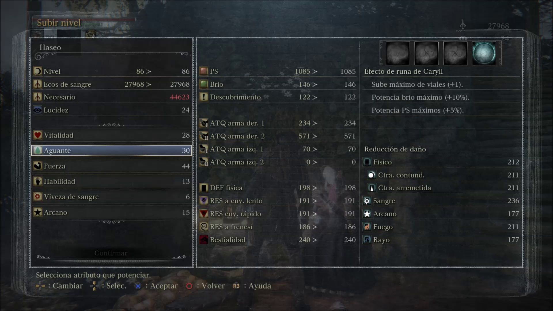 Una vez hecho esto, simplemente tendremos que hablar con la muñeca y seleccionar la opción de "Canalizar los ecos de sangre". Aquí nos saldrá un menú donde nos permitirán mejorar nuestras estadísticas a cambio de una determinada cantidad de ecos.