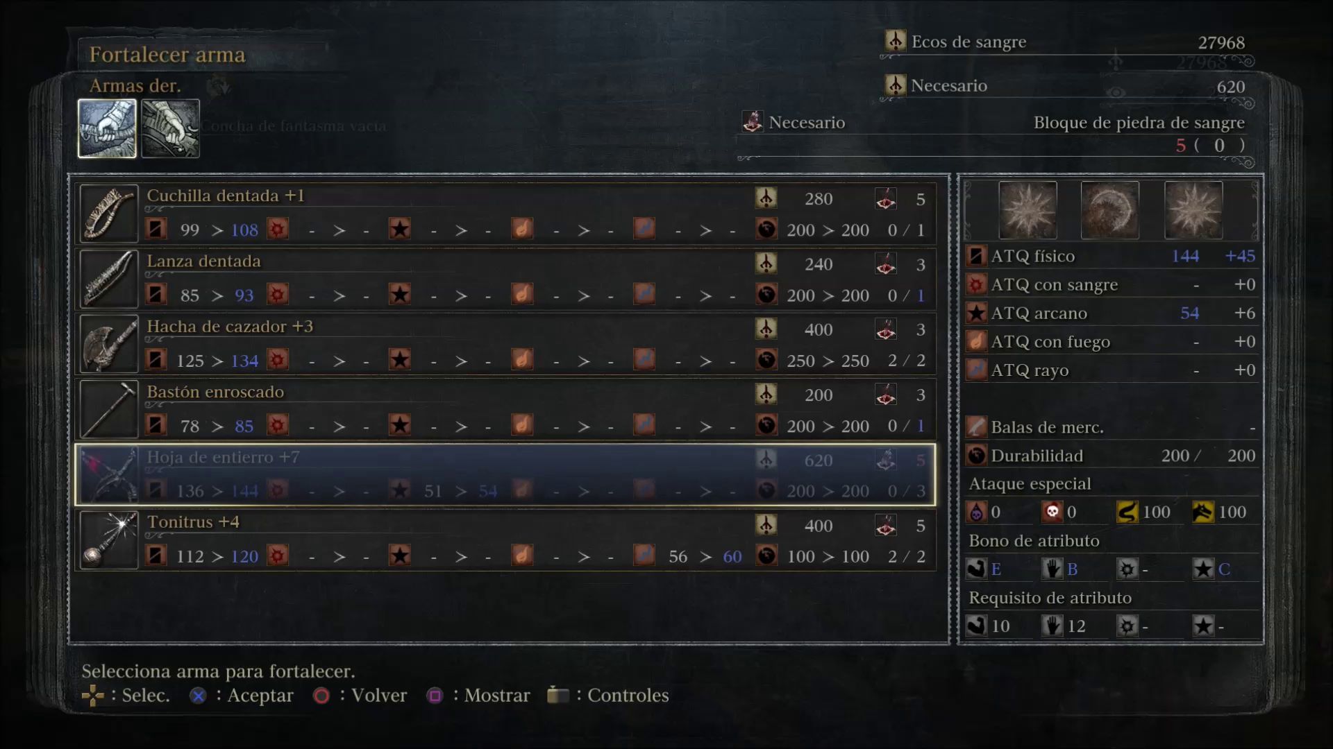 Cada mejora que le hagamos a un arma no solo incrementará su daño, sino que también mejorará el bonificador que obtendremos por nuestras estadísticas cuando la tengamos equipada y desbloquearemos huecos para añadirle gemas sangrientas.