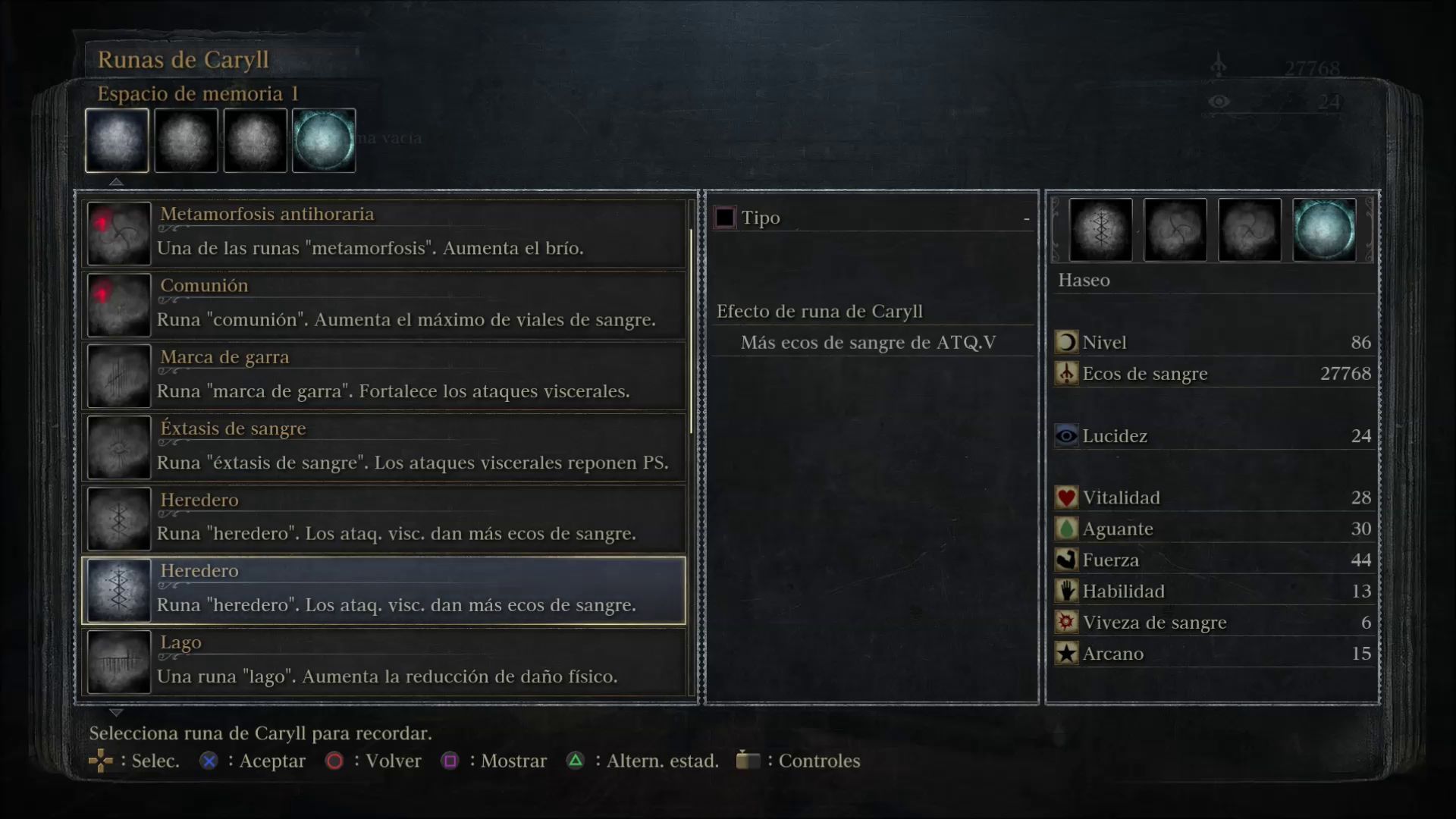 Estas runas nos darán beneficios diferentes a los de las gemas sangrientas, ya que afectarán directamente a nuestro personaje y no al arma. Entre estas mejoras encontraremos cosas como incrementar el número máximo de viales que podemos llevar encima, obtener más ecos de sangre de los enemigos, aumentar nuestra barra de vida o brío, mejorar nuestra resistencia a un determinado estado perjudicial, etcétera.