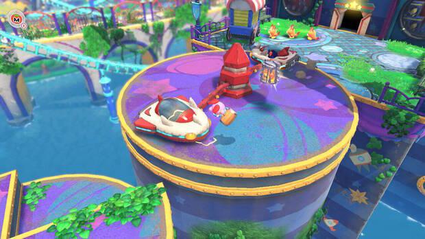 - Aparece en una de las plataformas circulares donde dan vueltas dos coche cohetes, pero solo si primero pulsas el botón que hay cerca en la plataforma anterior.