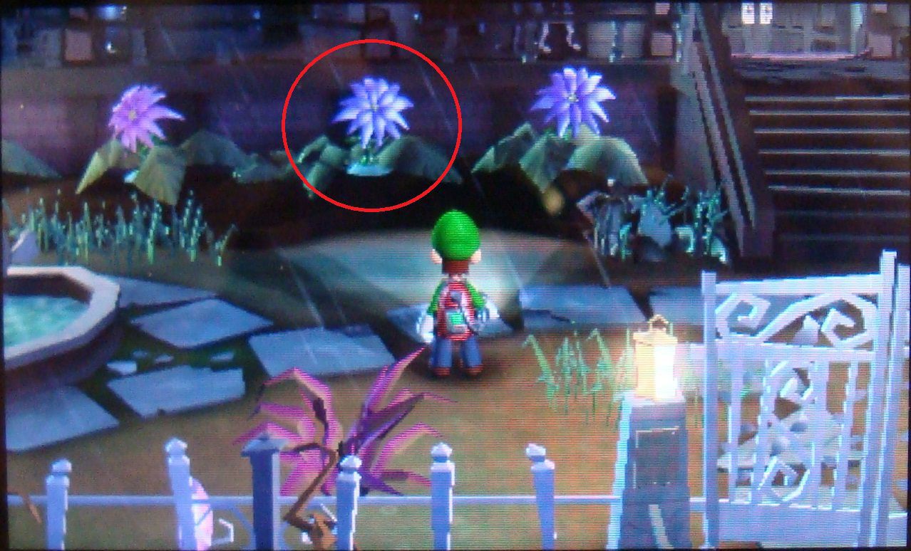 Nada más empezar la misión, sal de la mansión y deslumbra las flores violeta del lado izquierdo. Una de ellas te soltará la segunda joya. Recógela y recibirás una llamada del profesor dándote información del asunto. Luego entra en la mansión.