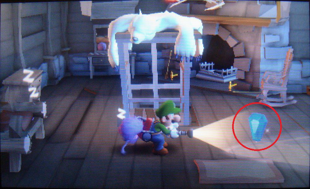 Ve hacia el espejo y verás que hay un robotito de los que explotan al iluminarlos. Hazlo estallar y repite con el resto de robotitos que vayan quedando al descubierto. Tendras que aspirar el hielo para dejar al descubierto el de abajo a la izquierda. Examina la puerta y aparecerán tres fantasmas que la sellan con cadenas. Tras la llamada del profesor, ve por la puerta de enfrente.