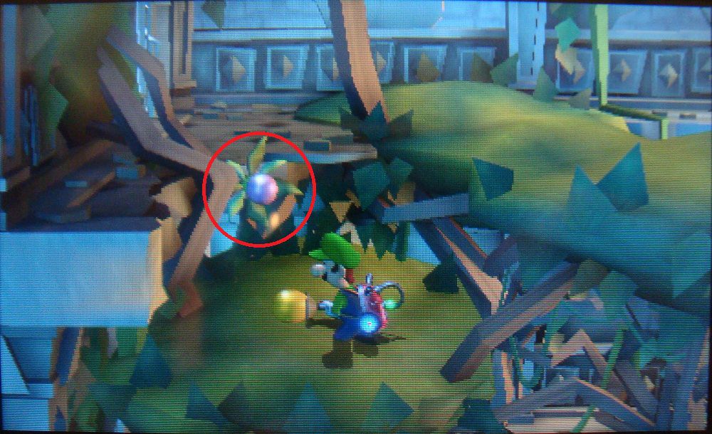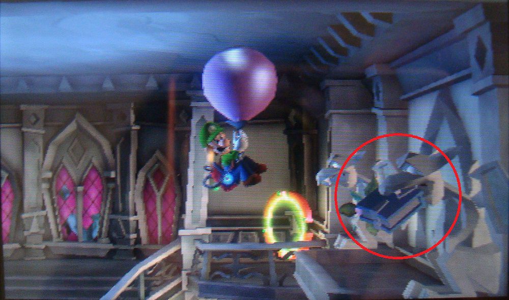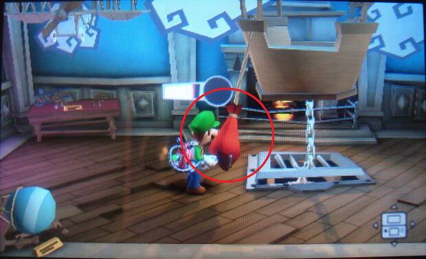 Tira de uno de los saquitos que cuelgan del globo para que aparezca un grupo de fantasmas. Cuando los tengas capturados, tira del otro saquito para obtener la octava joya. Vuelve al pasillo.