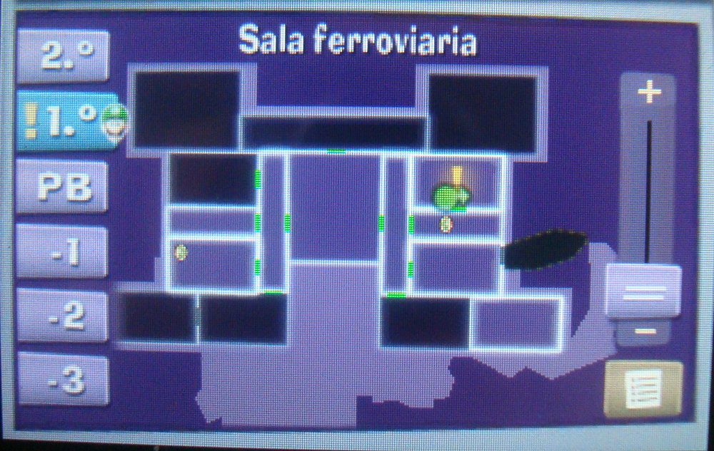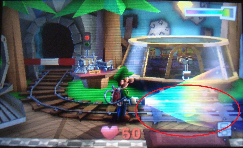 Despeja la sala de fantasmas. Antes de hacer nada, revela el trozo de vía que falta con el desoscurizador y súbete al tren. Obtendrás la 13ª joya.