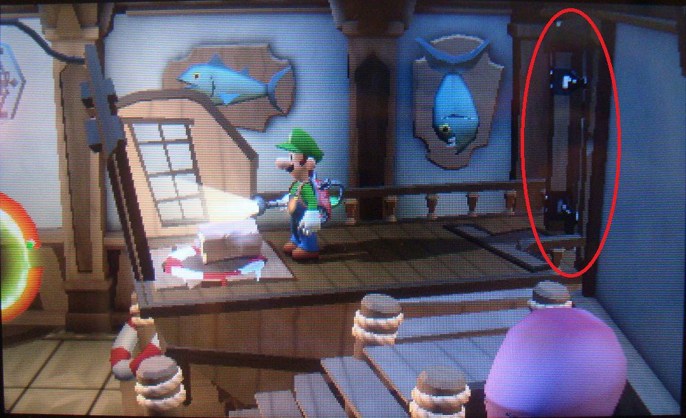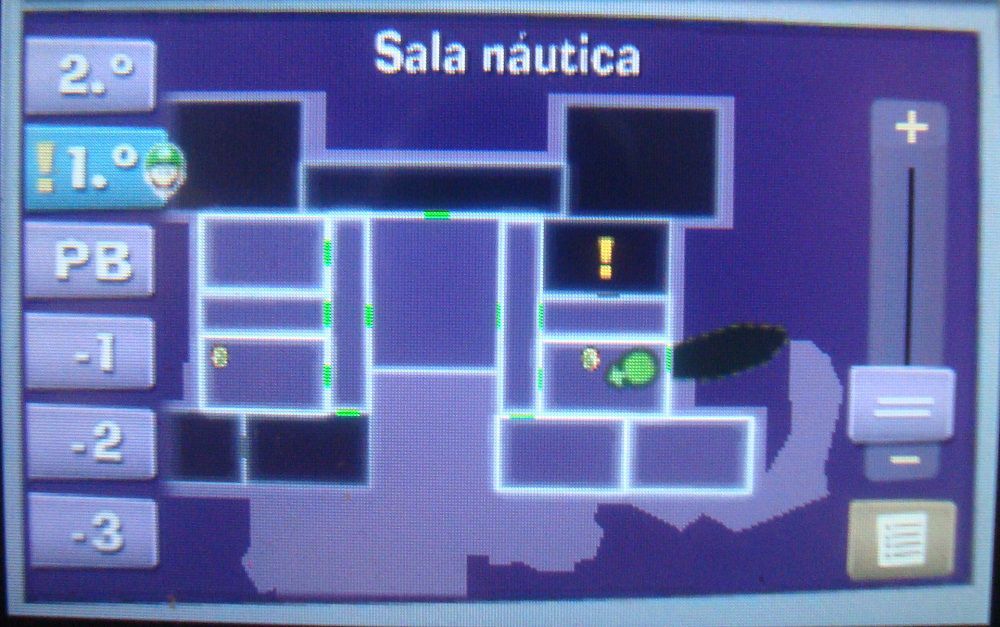 Vuelve a la habitación anterior y gira el timón donde estaba el fantasmas rojo hasta que la brújula marque el norte. Sal al pasillo y entra por la puerta inmediatamente superior.