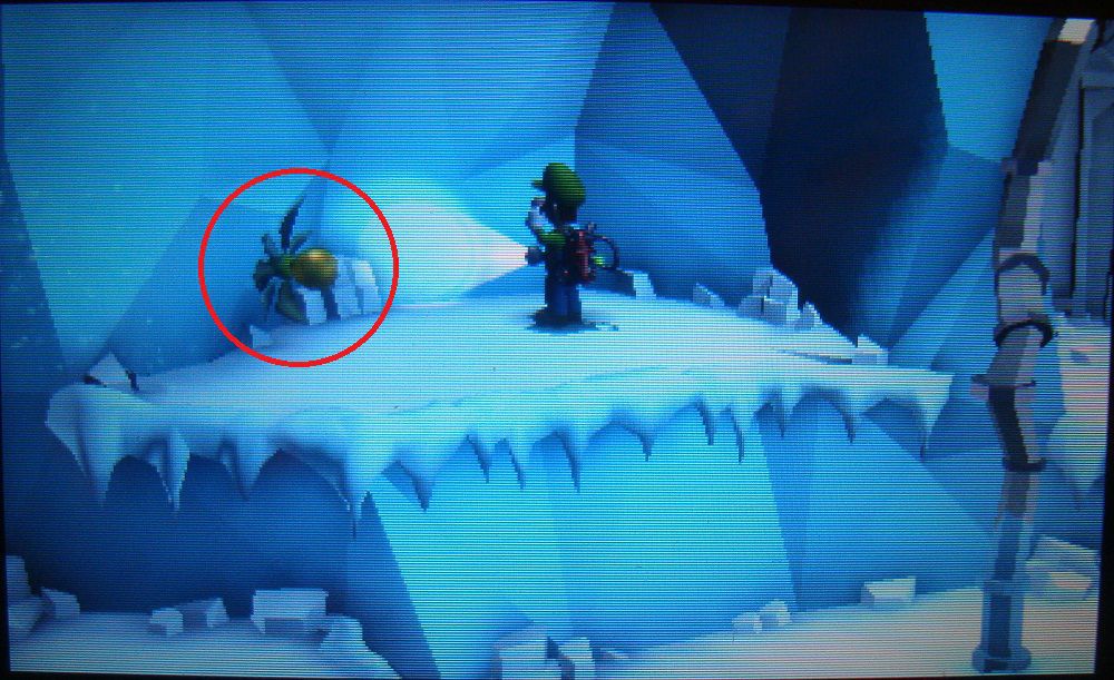 Sigue el reguero de monedas y examina la puerta. Aparecerán tres fantasmas, uno verde y dos de los que engullen. Acaba con ellos y ve por la puerta consecutiva a la que te aplastó.