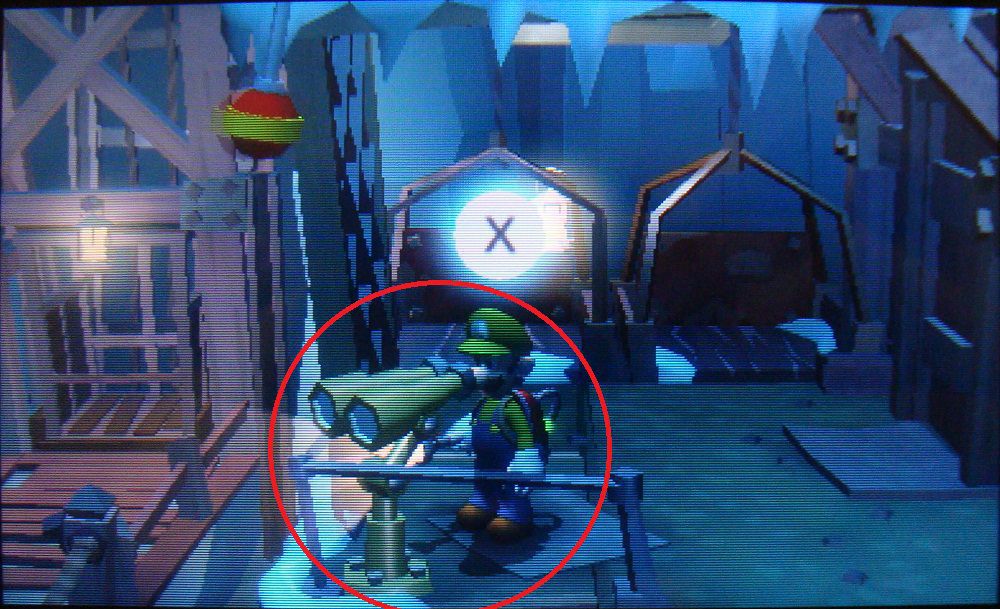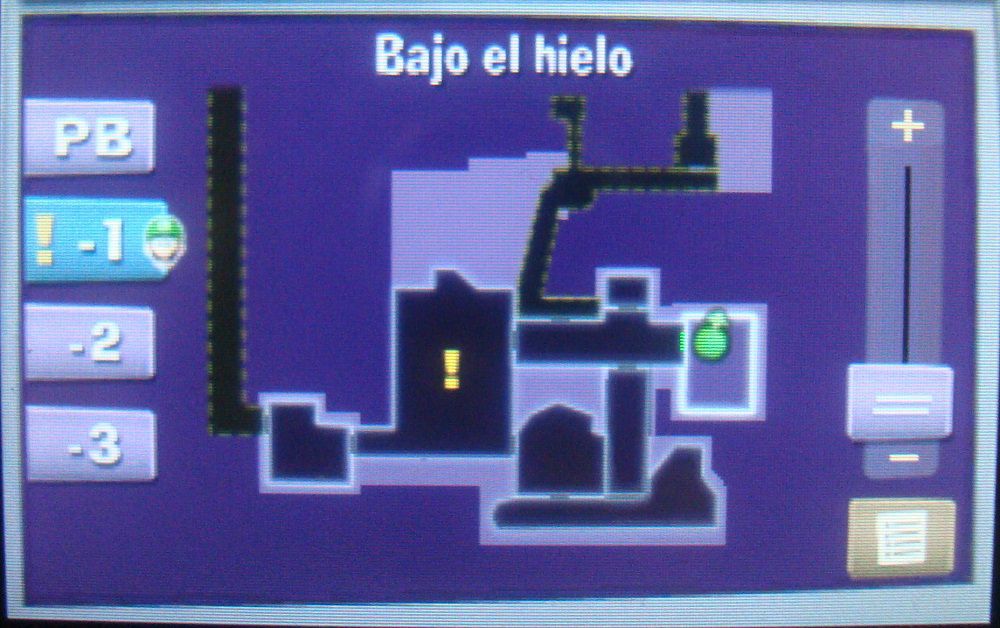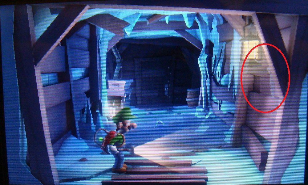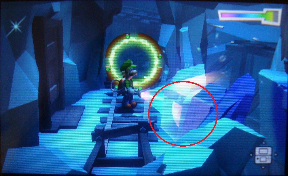 Usa el desoscurizador en la pared de la derecha para revelar un pico colgado. Hazlo girar aspirando y se moverá la pared hacia delante, haciendo caer unas maderas. Lánzalas al hielo y luego ponte encima para que se rompa.
