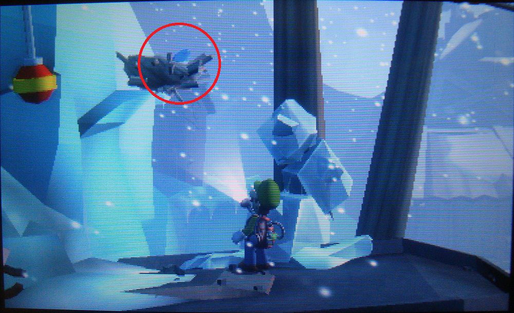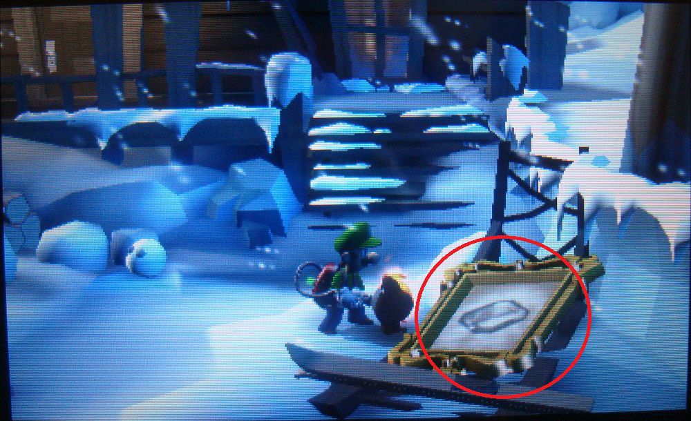 En el lado izquierdo, revela con el desoscurizador la caja que había antes aquí. Coge el teletransportador para absorber los orbes en el otro lado y regresa al lugar de la caja para recoger la joya, oculta entre la nieve.