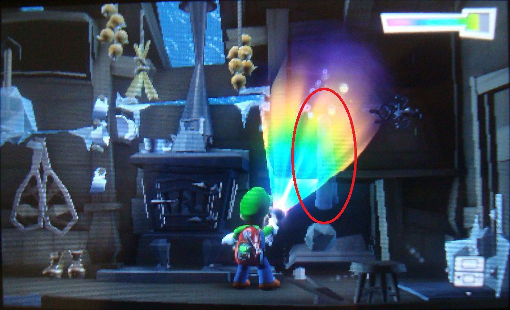 Aspira los montoncitos de nieve de la izquierda, enciende la barbacoa y coge el pollo llameante. Baja las escaleras y úsalo para derretir el hielo que cubre el cuadro. Usa el desoscurizador.