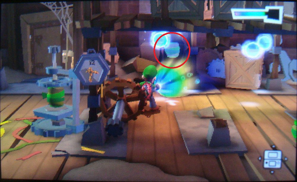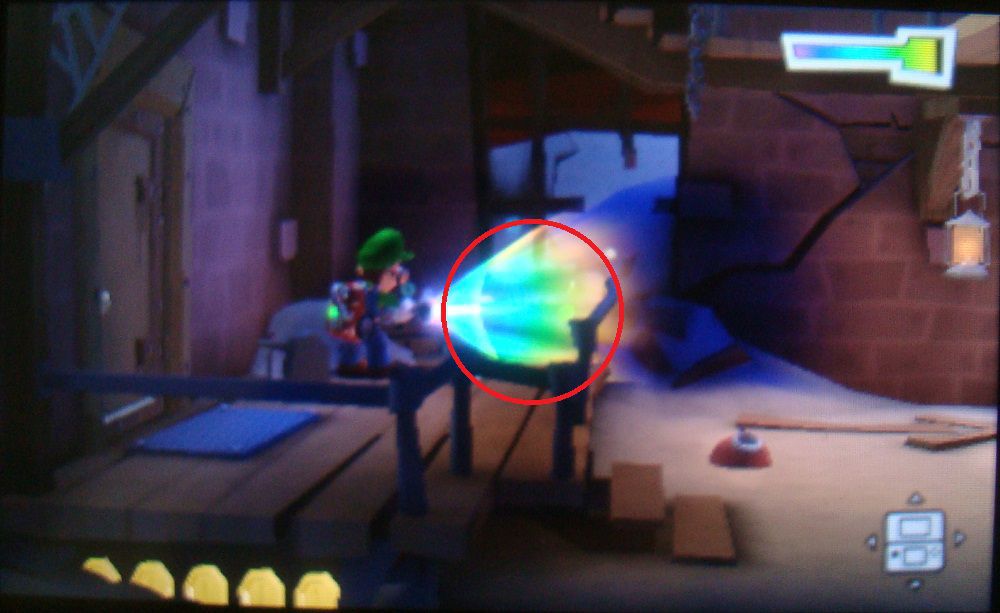 Tira de la cinta verde del rollo que hay en el artilugio que toqueteaba el fantasma. Con el desoscurizador, busca un rollo igual oculto por las cajas de atrás. Recógelo con el aspirador y ponlo donde estaba el anterior. Tira de la cinta y obtendrás la segunda joya.