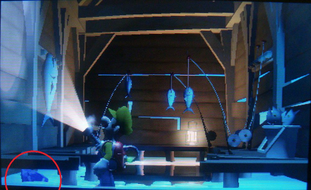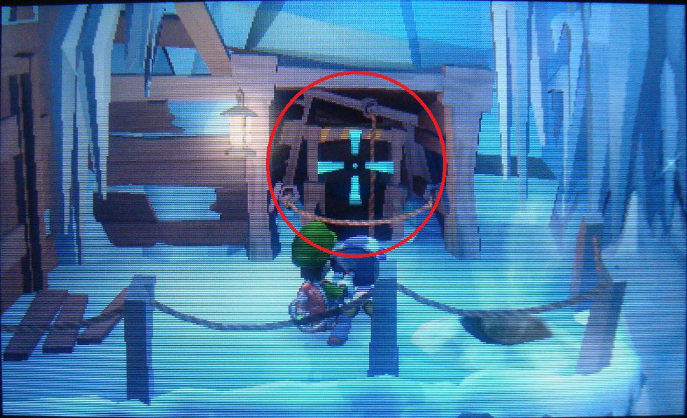 Tira de la cuerda del puente para enderezarlo y cruza por él. Tira de la cuerda en el otro lado y el puente estará recto. Vuelve a por Toad para que te siga. Activa el mecanismo de teleférico iluminando el panel verde. Súbete a él y regresarás al balcón de antes. Mira por los binoculares y busca la quinta joya en la pared congelada. Un cuervo la recogerá y depositará en el barril cercano a Toad. Regresa abajo, recógela y examina el ascensor.