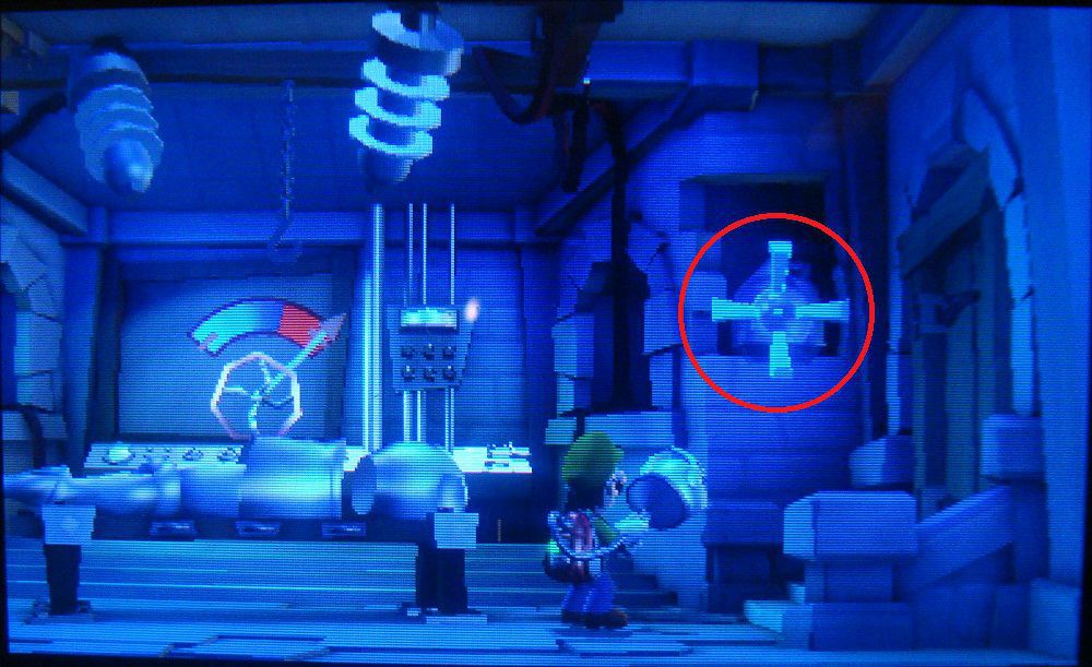 Pon a Luigi mirando hacia la pantalla y camina hacia atrás mientras aspiras la rueda que hace subir la reja. Abre la puerta.