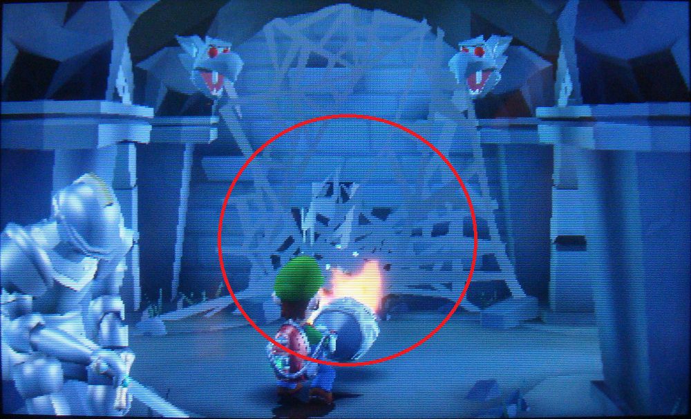 Examina la armadura y verás que te señala una dirección con su espada. Ve siguiendo las direcciones que te indica cada armadura que encuentres hasta que ya no haya ninguna visible. Esto es porque necesitas revelarla con el desoscurizador, en la parte de atrás de las gárgolas. Ve en la dirección que te indica y usa el desoscurizador en el cuadro. Saldrá una bola de telaraña, préndela en el fuego y vuelve sobre tus pasos: izquierda (armadura que revelaste), sur, izquierda, norte. Prende la telaraña y obtendrás la segunda joya.