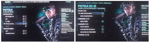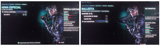 Podemos llevar tres armas, que seleccionamos con la cruceta, una pistola un arma especial no letal y un arma alternativa, subfusiles, fusiles, escopetas, francotiradores... Habitualmente lo mejor es llevar un arma con silenciador tanto en pistola como en alternativa, recomendaría la pistola SC-IS con todas las mejoras y el Subfusil SC400S con todas las mejoras, para el arma especial la Ballesta con los dardos de gas somnífero ya que su pequeño rango muchas veces nos permite noquear a 2 enemigos a la vez.