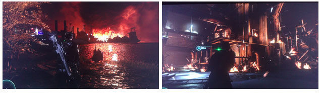El ataque de "Combustible Americano" ha creado una ola de incendios, avanzando un poco nos reunimos con un equipo del ejército que había sido enviado a detener el carguero, están enzarzados en un tiroteo con hombres de los ingenieros y nos informan que hay un líder de estos en la zona, ayudamos al equipo a librarse de los enemigos llegando a una planta repleta de enemigos con un operador Dron, si tenemos el Trirrotor nos será fácil localizarle y noquearle, esta arriba al fondo a la derecha, hay un montón de recovecos nos será fácil pasar desapercibidos.