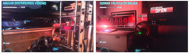 Avanzando hacia el destino tras un par de pasillos con enemigos, llegamos a las depuradoras, están vertiendo el veneno en 2 puntos, tenemos que llegar a ellos y desactivarlos 10:00 min de tiempo, ambos están vigilados por varios guardias y uno acorazado, una vez desactivemos las bombas de veneno, Grim nos informa que el patógeno ha llegado al agua y debemos cerrar la válvula de salida.