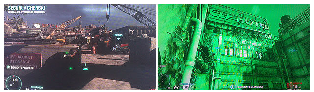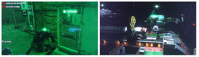 Ahora nos dirigimos a la subestación para cortar la energía para entrar en el complejo, tenemos un miliciano un operador Dron y una cámara, entres 2 es muy sencillo, salimos a la subestación y hay 2 puntos para cortar la corriente que deben activarse simultáneamente, por la zona hay cámaras, seguimos sin poder ser detectados, una vez cortemos la electricidad, tenemos que cruzar un camino lleno de Minas, el visor sónico nos viene perfecto, llegamos a una zona con camiones y vigilada por guardias, activan nuevamente la energía dejando la zona iluminada, con sigilo y noqueos llegaremos hasta la entrada a la base de misiles.