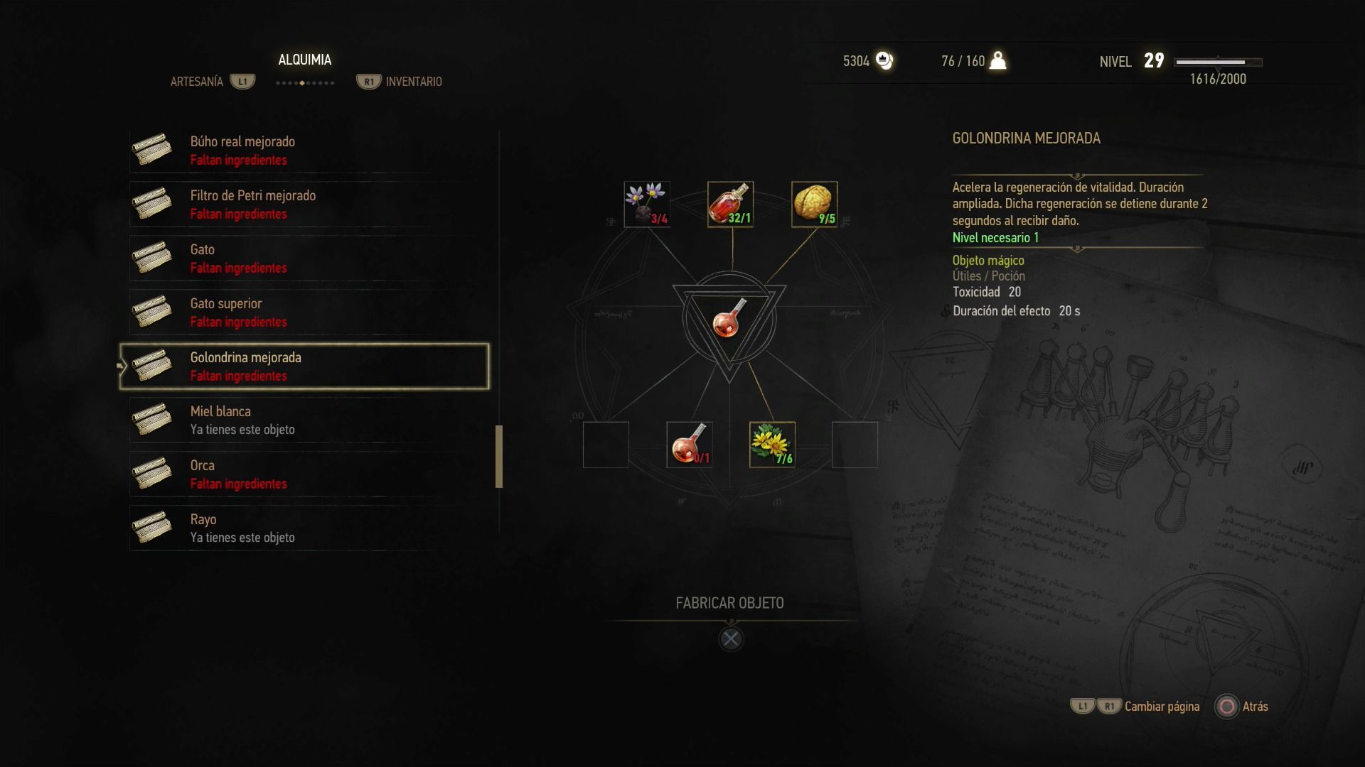 - Siempre ten equipada la poción golondrina (para recuperar vitalidad), ya que es la que más vas a usar durante los combates, y conviene tenerla a mano.