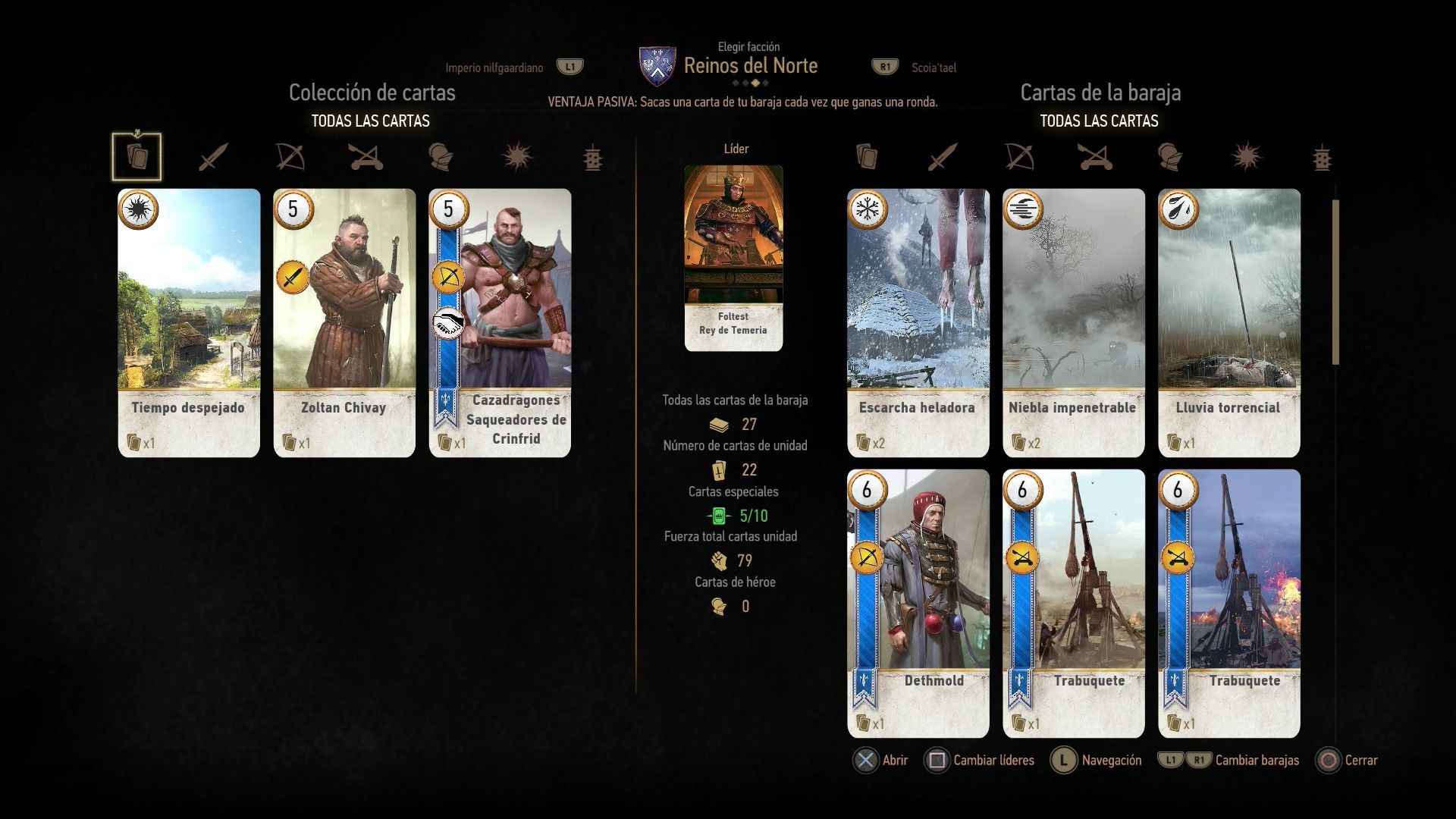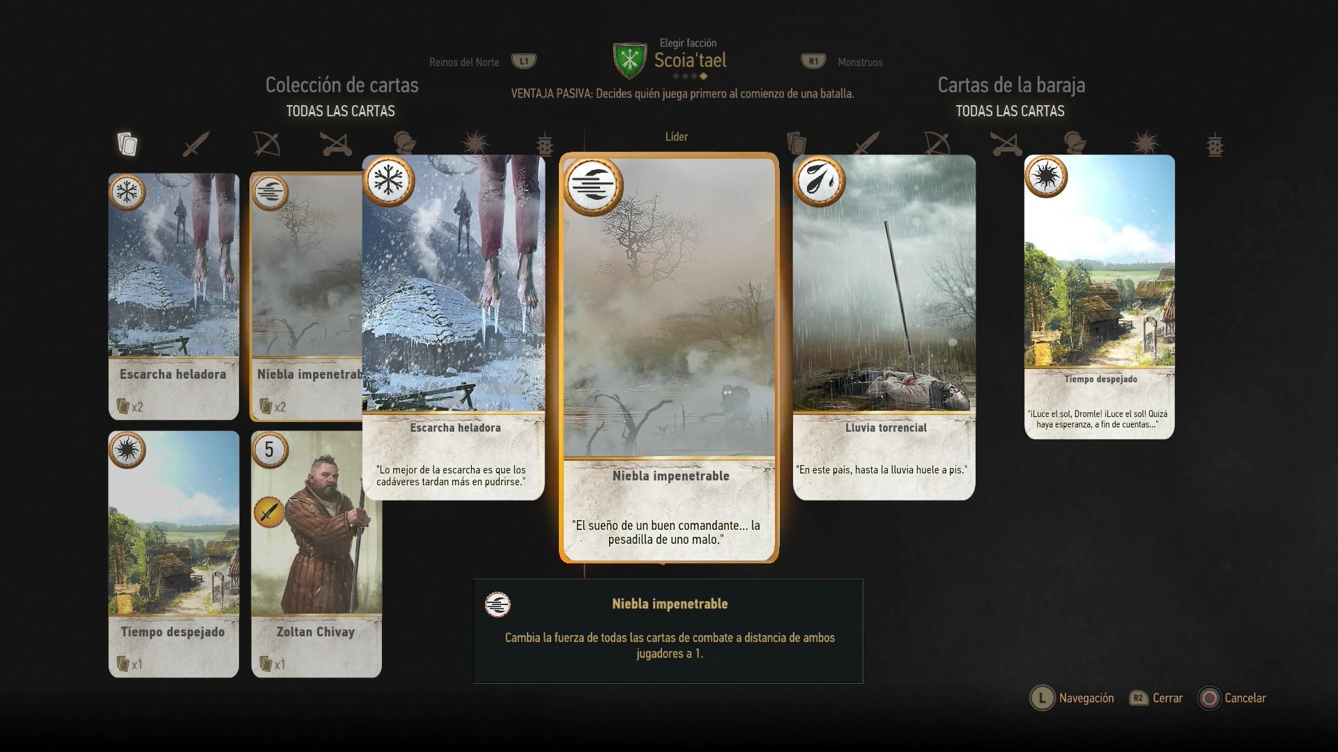 Hay tres tipos de cartas de clima, y cada una afecta a un tipo de unidad. La nieve afecta a las cartas de combate cuerpo a cuerpo, la niebla a las cartas de combate a distancia, y la lluvia obstaculiza a las cartas de asedio. También hay una carta de clima especial que elimina todas las demás cartas de clima del tablero, que es muy útil.