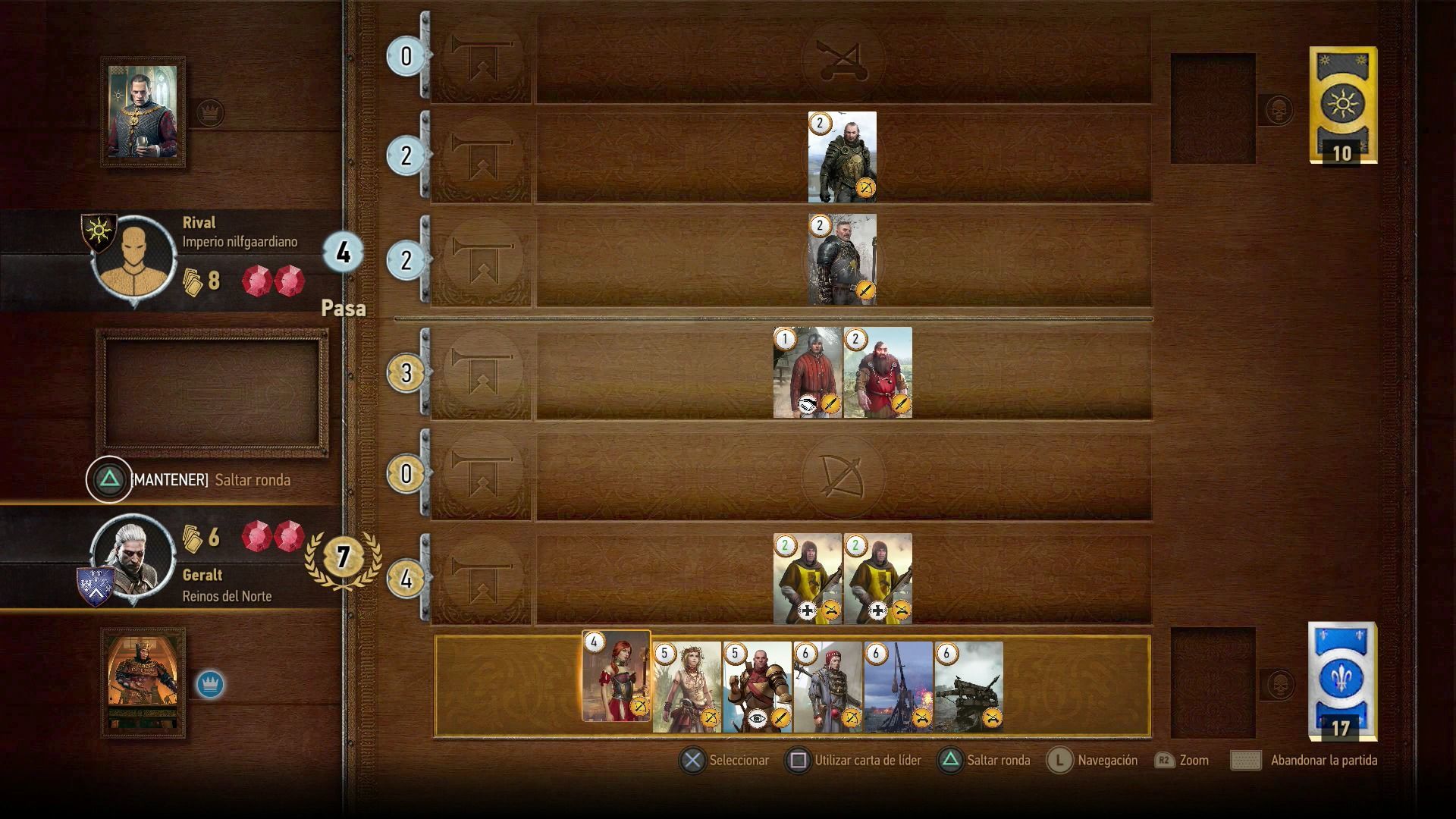 - Dosifica bien las cartas, ya que al inicio del combate sacas solo diez, y tienes que tener en cuenta que con estas tienes que conseguir ganar dos rondas, por lo que no puedes gastar las mejores cartas al principio del combate.