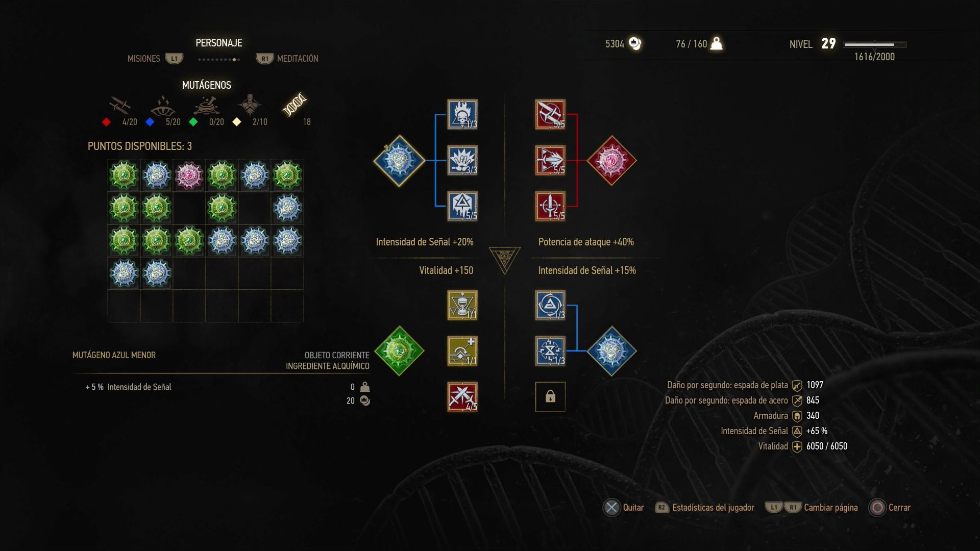 La segunda manera es junto con las habilidades del personaje, equipándolos para obtener bonificaciones. Los árboles de habilidades se diferencian por colores: rojo (combate), azul (señales), verde (alquimia) y amarillo (general), lo que también se aplica a los mutágenos, que pueden ser rojos, azules o verdes.