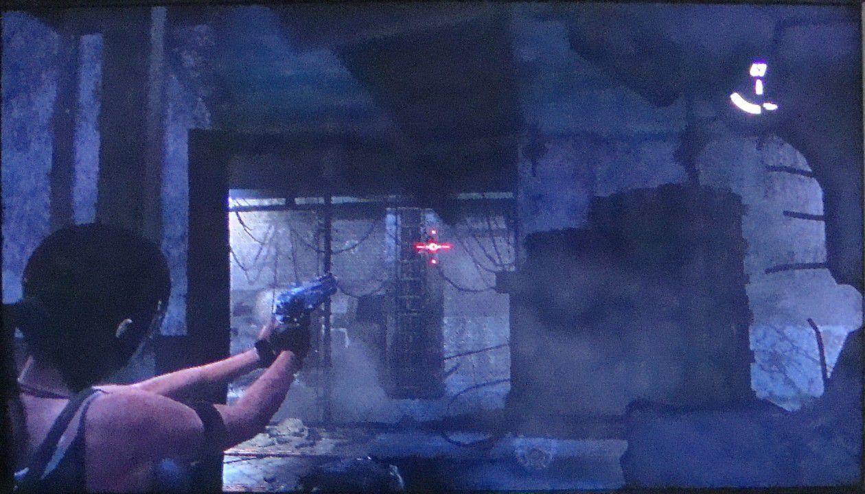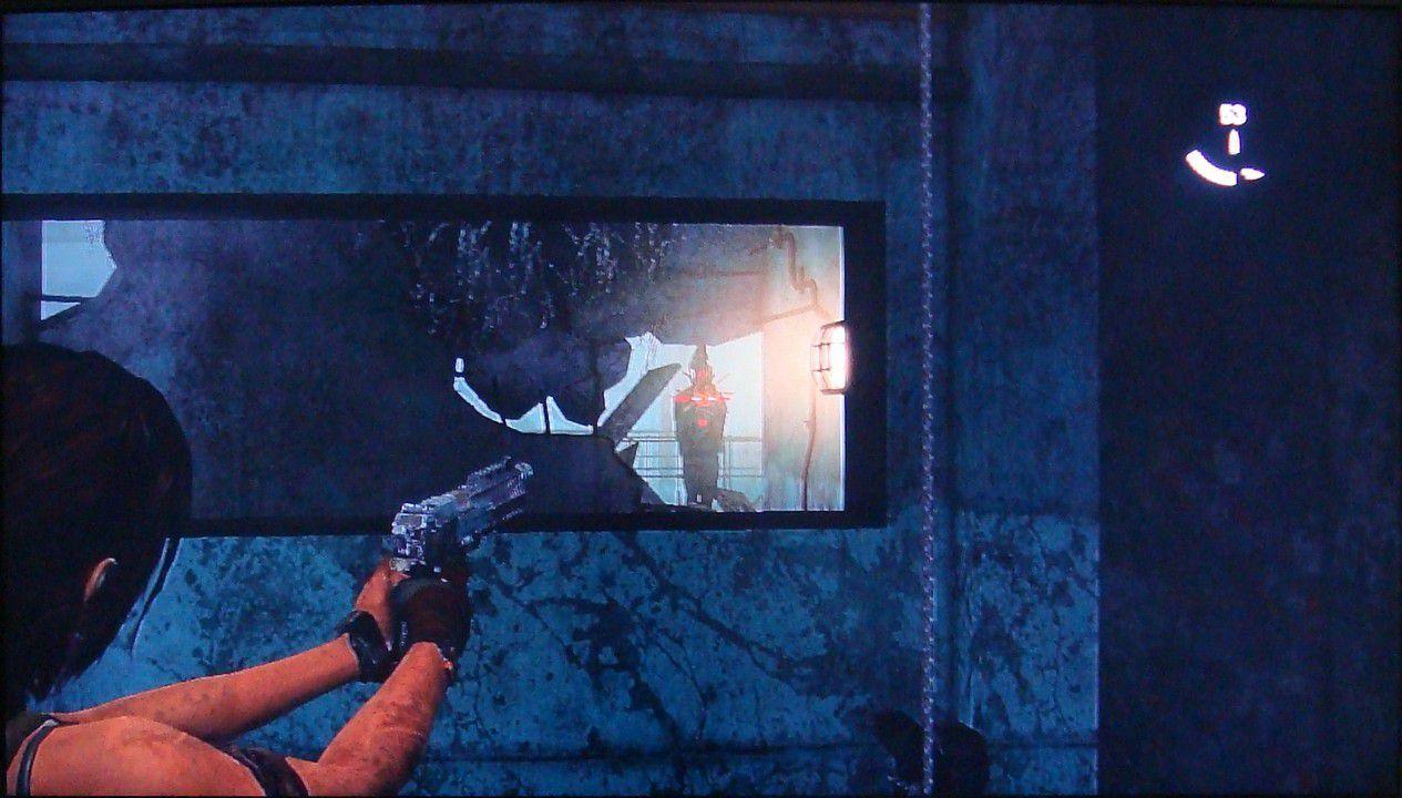 Antes de dejarte caer hacia la sala del campamento, dispara al tótem que cuelga detrás de la bombilla.