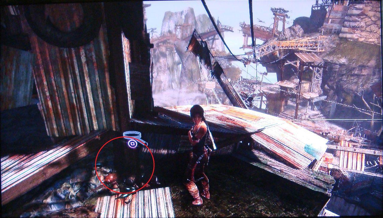 Sigue andando hasta que Lara resbale y cógete al saliente cuando salga el botón de acción en pantalla. Desplázate hacia la derecha, luego sube al margen inferior y finalmente trepa hasta la plataforma. Avanza y escoge el camino de la derecha cuando haya una desviación. Cruza por el tablón y sigue adelante hasta meterte por una apertura en la roca. Detrás tienes un nuevo campamento. Recoge todos los bidones amarillos y ponlos en el extremo cercano al campamento de la plataforma-balanza. Para recoger el que hay sobre el estante de madera, súbete a él y caerá. Conseguirás otro disparando una flecha de cuerda al peso que cuelga. Finalmente, con el peso que ya tengas, usa la plataforma-balanza para llegar al otro bidón que está sobre un estante. Una vez recogidos todos, desde la plataforma-balanza salta a la pared de delante, sujetándote con el piolet. Desplázate hacia la izquierda y salta a la escalera. Sube para recoger tu recompensa. Usa las plataformas colgantes para salir por el tubo y emprende el camino hacia el exterior por la desviación que antes no tomaste.
