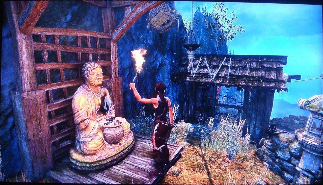 Baja por la tirolina, sube a la caseta y desde el hueco de la pared rota salta a la plataforma del otro lado para encender otra estatua.