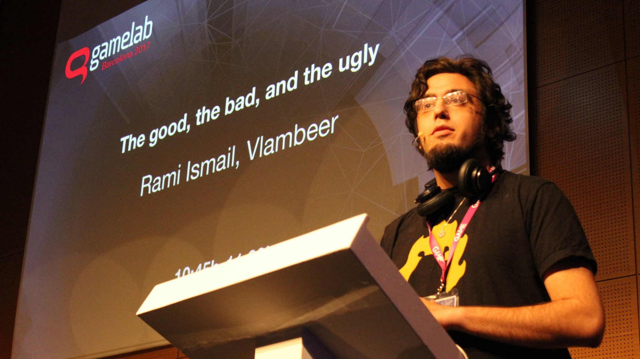 Como es la tercera vez que ha venido al Gamelab, pude estar un rato con él hablando (de hecho, diez minutos más de los que podía originalmente). Lo primero que le pregunté es sobre qué está haciendo en la actualidad, porque hace algo ya de tiempo de Nuclear Throne (un año y medio). Y lo cierto es que aunque su respuesta fue algo vaga, hay que darle cierto beneficio de la duda. Concretamente, están haciendo parches y añadiendo contenido a sus juegos y prototipos. Por si alguien está perdido, además, su compañero de Vlambeer, Jan Willem Nijman, está haciendo un juego que será editado por Devolver Digital que es Minit, y el último año lo ha dedicado a este juego. Ahora ya está más liberado de esta tarea, y se puede dedicar a volver a trabajar junto a Rami Ismail, pero por eso mismo seguramente no hayamos visto ningún nuevo juego de ellos en este tiempo. Como comentario extra, Rami comentó que Jan es muy bueno "empezando proyectos", mientras que a él se le da mejor "acabar proyectos".