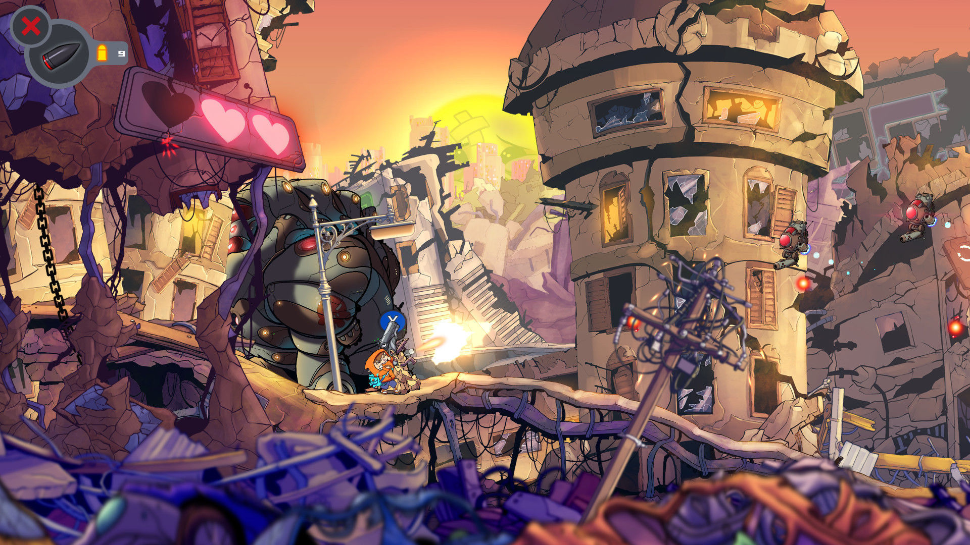 Cierto, Rise & Shine no sólo da mucha importancia a los tiros, sino que uno de sus protagonistas es una pistola. ¿Esto lo convierte en una especie de Gears of War en 2D?