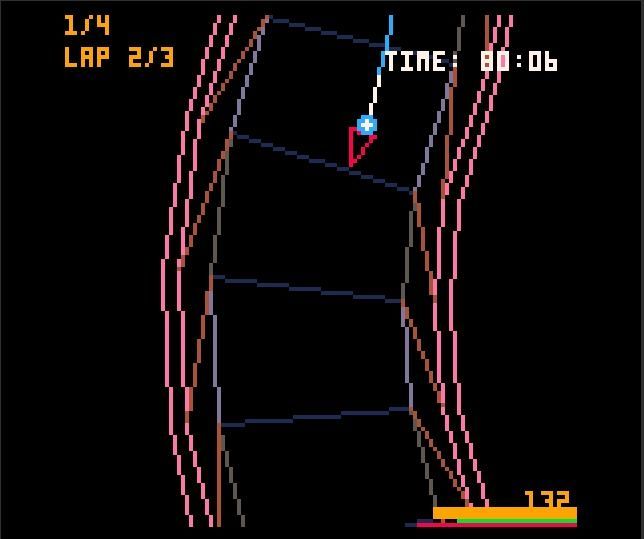 Podríamos considerar a este juego la versión PICO-8 de Wipeout 2048, pero realmente se parece más a la parte de carreras de The Next Penelope, el fantástico juego de Aurelien Regard que ya analizamos. En esta ocasión la cosa va, como es de esperar, de carreras de naves a lo largo de varios interesantes recorridos, y como dato relevante la estela que dejan las naves te sirve para hacerte una idea de que estas alcanzando a un rival, además de tener la posibilidad de usar un turbo para acelerar.