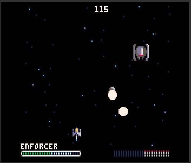 Un matamarcianos de desplazamiento vertical bastante difícil, en el que nuestra pequeña nave tiene que sobrevivir a la amenaza constante de los enemigos, los cuales pueden llegar a aparecer por detrás para sorprendernos y acabar con nosotros. Como detalles, el juego nos muestra el nombre y la vida que le queda a cada enemigo con el que estemos intercambiando disparos, y conforme pase el tiempo se nos irá rellenando una barra de misiles que nos permitirá disparar estos proyectiles de manera teledirigida, lo cual si el enemigo ha perdido su escudo es bastante provechoso.