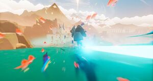 En Sword of the Sea encarnas a un espectro resucitado en un reino desolado, con la misión de restaurar la vida mientras exploras ruinas sumergidas y descubres las diversas culturas que alguna vez habitaron este mundo. Para desplazarte, utilizas la Hoversword, una espada flotante que combina las sensaciones de una tabla de snowboard, un monopatín y una hoverboard. Esta herramienta te permite ganar impulso para alcanzar altas velocidades y realizar saltos impresionantes, surfeando por tumbas que se hunden, naufragios misteriosos y campos de batalla petrificados.