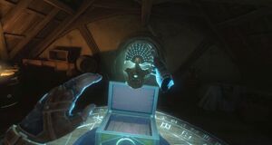 Visión de “glifo” / thief vision activada tocando el lateral de la cabeza, que resalta elementos interactivos y zonas ocultas.