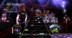 Esta entrega, además de un gameplay excelente, teniendo que tocar con precisión en la guitarra de juguete las notas que van apareciendo en la pantalla, y que incluía un modo historia, introdujo batallas contra jefes, incluyendo duelos de guitarra contra figuras icónicas del rock. Si por algo destacó es por su espectacular lista de canciones, con algunos de los mayores éxitos de la historia del rock, desde grandes clásicos a temas más recientes, pertenecientes a grupos como Queens of the Stone Age, Sex Pistols, Slipknot, Santana, Rage Against the Machine, The Smashing Pumpkins, Pearl Jam, Muse, Sonic Youth, ZZ Top, Weeze, Metallica, The Rolling Stones, Black Sabbath, Iron Maiden, The Strokes, Scorpions, Aerosmith, Alice Cooper, Red Hot Chili Peppers, Cream, Guns N' Roses y Guns N' Roses y The Killers, entre otros muchos, que hacen que estamos ante la que probablemente sea la mejor banda sonora que ha tenido nunca un videojuego si eres un amante del rock.