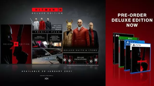Hitman 3 se prepara para debutar el próximo 20 de enero de 2021 en PlayStation 5, PlayStation 4, Xbox Series X/S, Xbox One y PC, de la mano de Square Enix y IO Interactive. Desde Koch Media se encargarán de distribuir en España las versiones físicas del juego; y además han anunciado el Trinity Pack, que estará disponible con la reserva de cualquier edición de Hitman 3. A su vez, también se ha presentado la Deluxe Edition.