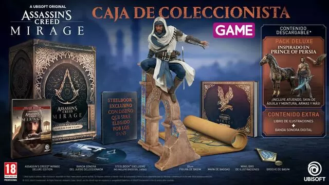 Quienes quieran reservar ya Assassin's Creed Mirage para PS5, PS4 y Xbox podrán escoger entre la Deluxe Edition (que incluye un atuendo extra, una skin exclusiva de montura, una skin exclusiva de águila, armas exclusivas, entre otras cosas) o la Collector's Edition, que además de todo lo anterior también incluye el siguiente contenido:
