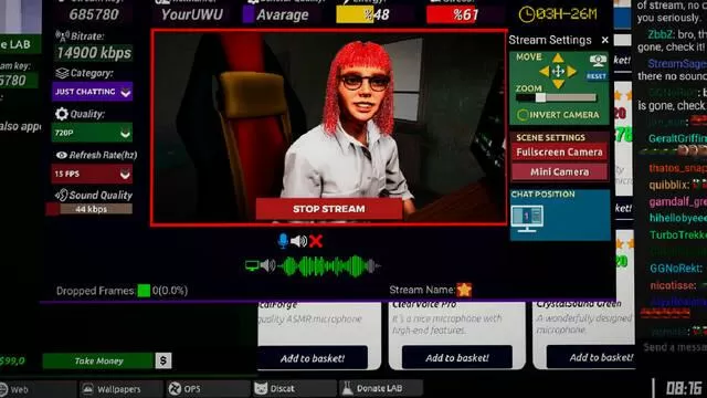 Cuando el dinero empiece a circular se podrán hacer inversiones: nuevos componentes para el ordenador, micrófonos, piscinas de plástico de esas que tanto gustan en cierta categoría de Twitch, y hasta ampliar la casa y contratar a otros streamers que trabajen para nosotros. Pero antes de que ocurra todo eso, las emisiones tienen que ir bien, y en eso se centra una de las partes nucleares de este videojuego: las decisiones.