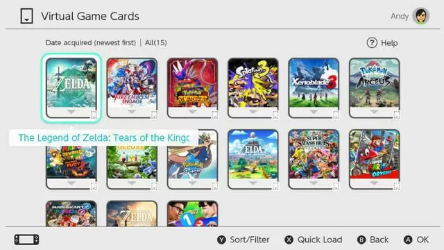 - Tarjetas de juego virtual: El software digital comprado para Nintendo Switch, DLC y algunos títulos gratuitos ahora son tarjetas de juego virtuales y se muestran en una lista dentro de este menú. Puedes cargar y expulsar virtualmente tarjetas de juego entre hasta dos consolas Nintendo Switch. Las tarjetas de juego virtuales pueden prestarse a otros usuarios que pertenezcan al mismo grupo familiar de cuentas Nintendo. Para más información, consulta la Guía de Tarjeta de Juego Virtual.