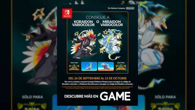 Consigue a Koraidon o Miraidon variocolor para Pokémon Escarlata o Púrpura de regalo en tu GAME más cercano
