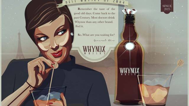 Este diseño publicitario que promociona una ficticia bebida alcohólica que evoca recuerdos pasados aparecerá implementado en el entorno de juego de esta producción y formará parte del telón de fondo de la brillante ciudad de Neo-París.