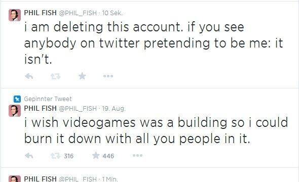 Tras un largo periodo de inactividad en la red social, Fish había regresado con sus características polémicas, ya fuese por los disturbios en Ferguson cuando comentó que los jugadores no merecían Fez 2 o por defender a Zoe Quinn, desarrolladora de Depression Quest, de acusaciones en Twitter.