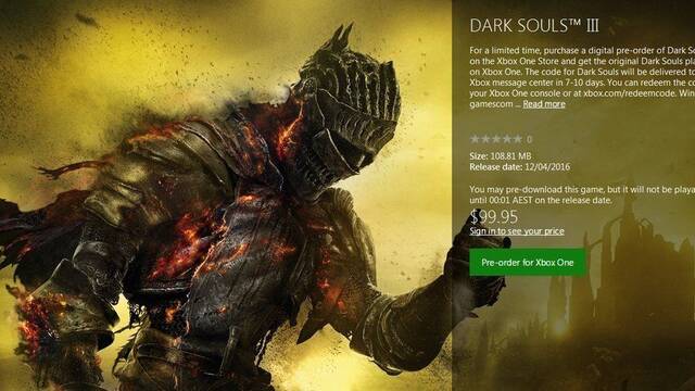A través de la Xbox Store australiana, usuarios de reddit habrían confirmado que el Dark Souls original pronto será retrocompatible con Xbox One, y que vendrá de forma gratuita junto a las reservas de la tercera entrega, Dark Souls III -que llegará el 12 de abril-.