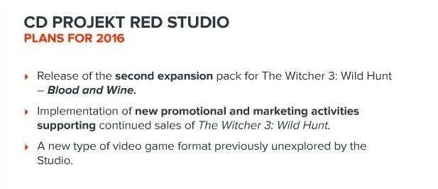 Entre lo más relevante está la intención de lanzar "un nuevo tipo de formato de videojuego no explorado por el estudio" en 2016, además de la expansión Blood and Wine de The Witcher III: Wild Hunt.