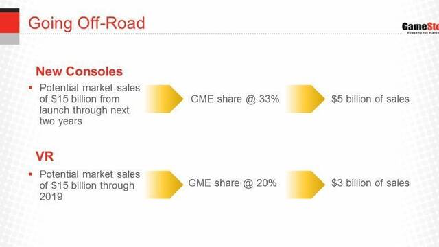 En el caso concreto de las consolas, estima que GameStop coparía aproximadamente un 33% de las ventas generadas en los periodos de lanzamiento, lo que se traduciría en 5.000 millones de dólares en ventas por las nuevas consolas en 2 años. A eso habría que añadir 3.000 millones en sistemas de realidad virtual (en este caso, hasta 2019).