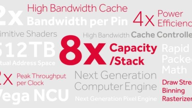 Según esta imagen, que compara los datos con la arquitectura Polaris, tendría cuatro veces más de eficiencia energética, duplicaría el rendimiento, doble ancho de banda por pin, una capacidad ocho veces mayor por pila o stack con segunda generación de memoria de alto ancho de banda y 512TB de espacio de direcciones virtuales.