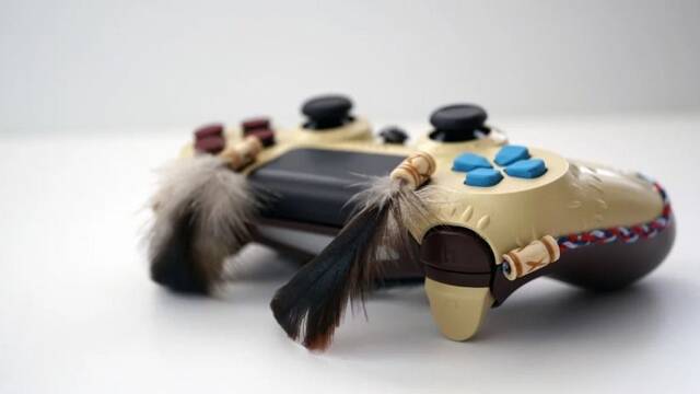 Empleando una paleta de colores que recuerda a la indumentaria de Aloy, la protagonista del juego, el DualShock 4 de Horizon: Zero Dawn combina los colores tierras con el naranja y el celeste, así como plumas e hilo como complementos.