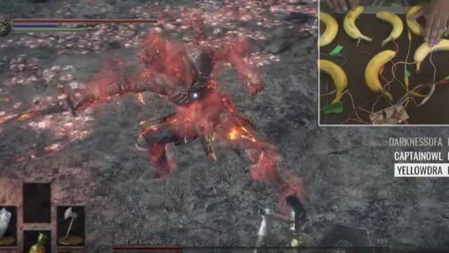 Hasta ahora, hemos visto partidas a la saga creada por Hidetaka Miyazaki con los bongos de Donkey Konga y hasta con la guitarra de Guitar Hero, pero nunca con unas bananas conectadas de manera estratégica para transmitir las órdenes de movimiento a su personaje en el difícil juego.