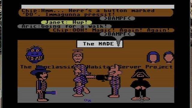 Habitat fue un proyecto de Lucas Arts para Commodore 64 diseñado por Randy Farmer y Chip Morningstar a finales de los ochenta. El título trasladaba a sus jugadores a un mundo virtual conectándose a través de Internet y con un sistema de interacciones variadas, incluyendo el chat por texto. Se trataba de un escenario vivo en función de las posibilidades de la época en el que socializar con otros jugadores.